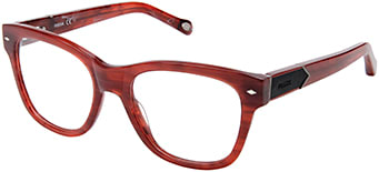 Model FOS 6075 is offered in Red Horn (pictured), Havana, and Black. The style features handmade acetate temples with an arrow-shaped temple accent (inspired by the Fossil diamond logo) in faux leather. Men’s optical model FOS 6076 is a vintage-inspired and rectangular-shaped frame.
