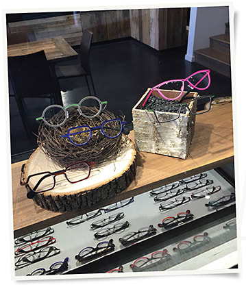 We like to display the eyewear artistically. We only use natural materials to display frames. We’ll place frames on thick slices of tree trunk or twisted grapevine. We use twine balls that look like tumble weeds and river rocks.