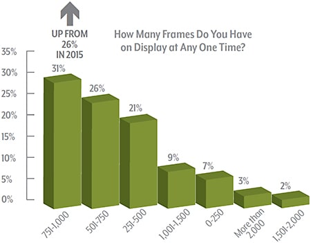 The numbers paint the picture. More than half of ECPs’ assortments are focused on midrange product (51%), yet a full 30% of their mix includes high-end product. At the same time, most ECPs (31%) say they display between 751 and 1,000 frames at the same time—this number increased by a respectable 5 percentage points from 2015.