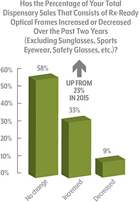 Eyewear—and the right product mix—is a critical component of any optical business’ success. In fact, a full 67% of ECPs’ total dispensary sales consist of Rx-ready optical frames (excluding sunglasses, sports eyewear, safety glasses, etc.). For a third of ECPs (33%), this number has increased since 2015.