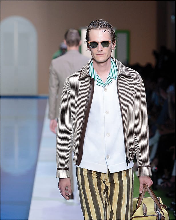 Pictured is sunglass model FF 0228/S as displayed on the Fendi Men’s Spring/Summer 2017 runway. Fendi FF 0228/S features two leather layers and a stainless steel brow-line shape. A pop of color is found on the front with a thin rim framing the lenses, and acetate end tips also serve as a vibrant color detail.
