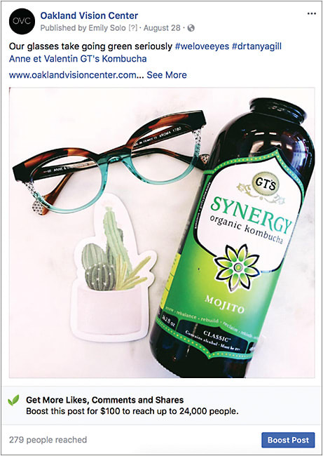 My practice recently hosted a trunk show in which we garnered five new patients who cited our Facebook ad as the referral source. The boosted post reached 2,274 people. We spent $100 and grossed $1,500 from three of those customers (two did not purchase glasses).