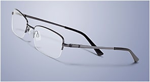 Pictured is model G4036 in Gunmetal, a staple semi-rimless rectangular style featuring satin stainless steel and two-toned temples with a pressed zigzag pattern. The style is available in extended-fit sizes and comes with custom adjustable nose pads for added comfort.