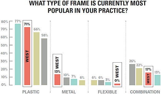 How is that reflected in optical? Nearly three-quarters (74%) of jobs are made in poly. That’s substantially more than other regions. Western ECPs also sell more AR (86% of jobs) than other areas.