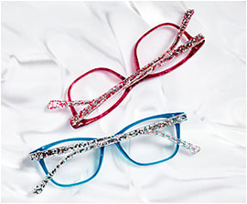 In stainless steel, acetate, or combination frames, the new collection features fun patterns, eye-catching textures, glitter elements, and more. Stainless steel styles feature two-tone coloring with temples laser-etched in floral and geometric designs.