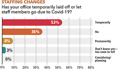 Additionally, 52% of practices across the country surveyed in late May had temporarily laid off staff members due to Covid-19, and another 6% had permanently let staff go. Nearly 40% had kept their entire staff intact.