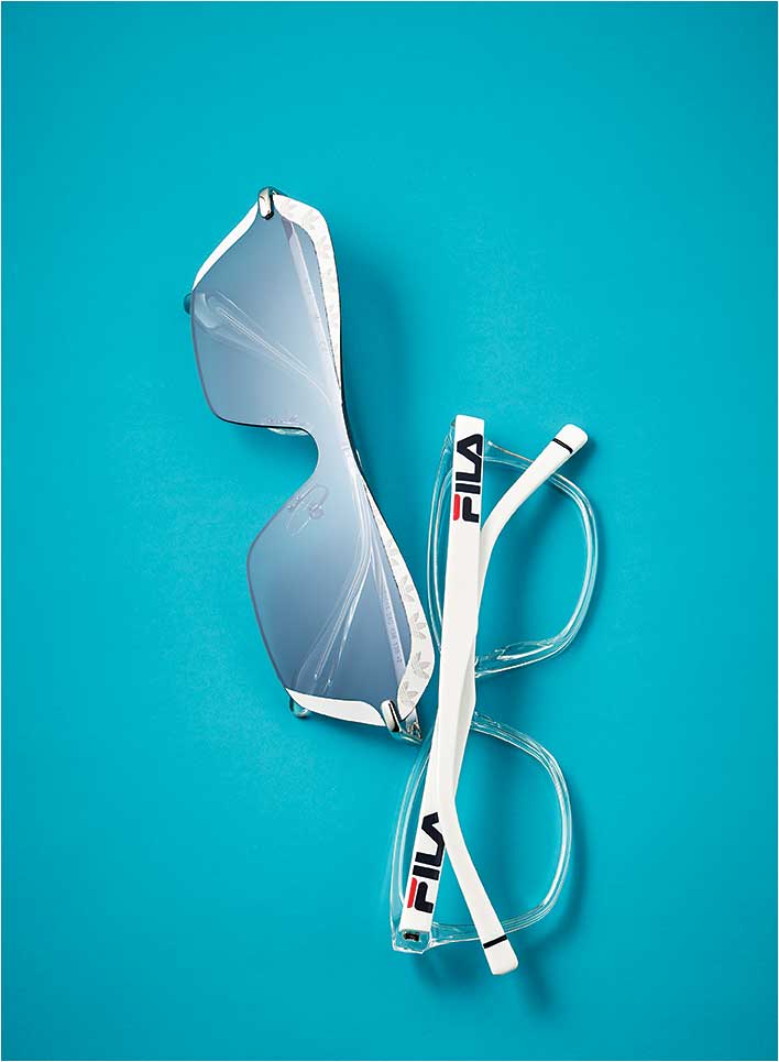 From left: The Adidas OR0015 shield from Marcolin features the brand’s trefoil pattern printed directly on the lens, plus floating, adjustable nose pads and thin metal temples for a sleek and sporty silhouette. Fila model VF9467 from De Rigo REM is a streetwear-inspired style, fusing fashion and function with bold logos on the temples and blue-light-filtering lenses to help reduce eye strain.
