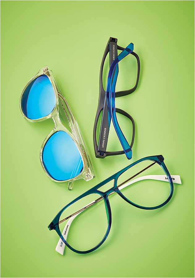 Clockwise from top: Armani Exchange model AX3073 from Luxottica is a fashionable boxy frame pairing a matte gray front with neon blue temple tips. Levi’s LV1000 from the brand’s anticipated new eyewear assortment from Safilo serves up classic cool with a ’70s-inspired pilot silhouette. The Op Skimboard style from ClearVision Optical makes waves with on-trend crystal acetate and polarized flash-mirror lenses.
