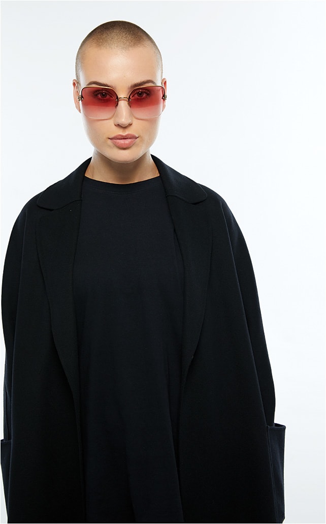 The Alexander McQueen AM0271S from Kering Eyewear serves up protection and style in an oversized gold semi-rimless look with rose gradient lenses punctuated with crystal-encrusted skull accents.