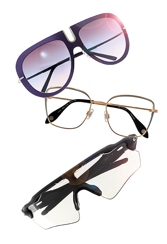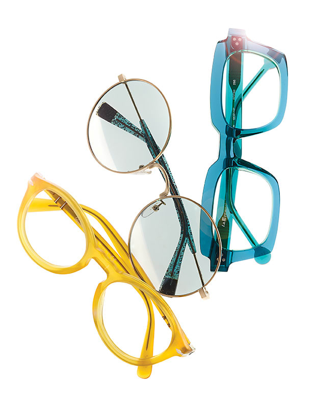 From left: The Persol PO3237V from Luxottica serves up a cult-classic shape in a rich honey color. Furla style SFU235 from De Rigo REM pairs glitter-infused temples with a hipster rounded front with two-toned lenses. The l.a.Eyeworks Fotini frame takes a deep dive with an eye-catching sea water-inspired hue.