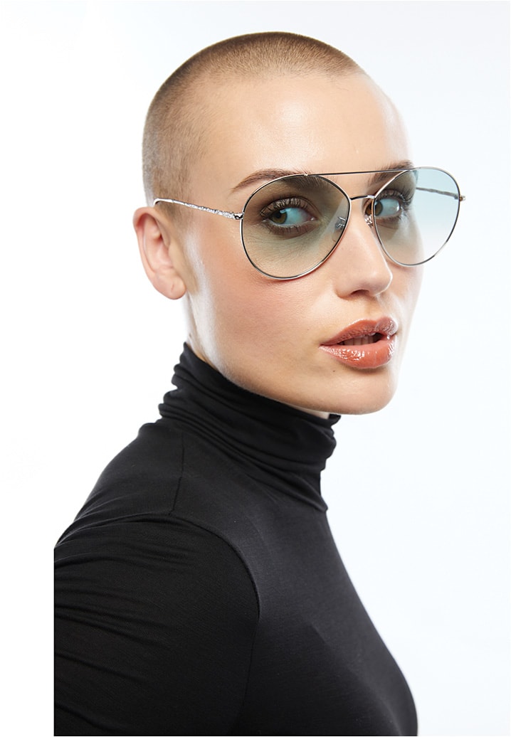 The Givenchy GV7170/G/S from Safilo is on point with lightly tinted blue lenses in an oversized silver aviator silhouette with crystal-encrusted temples.