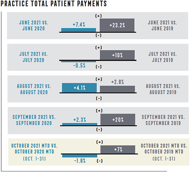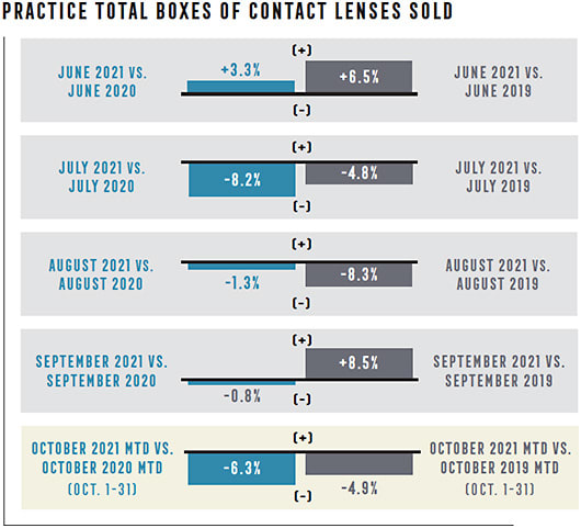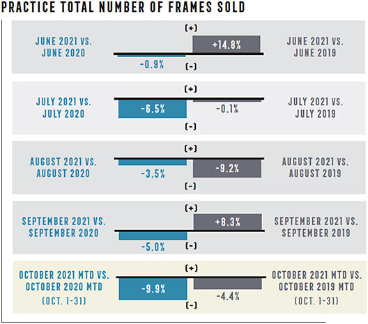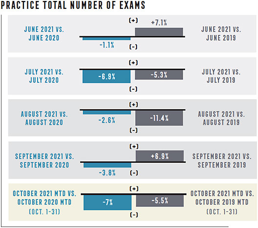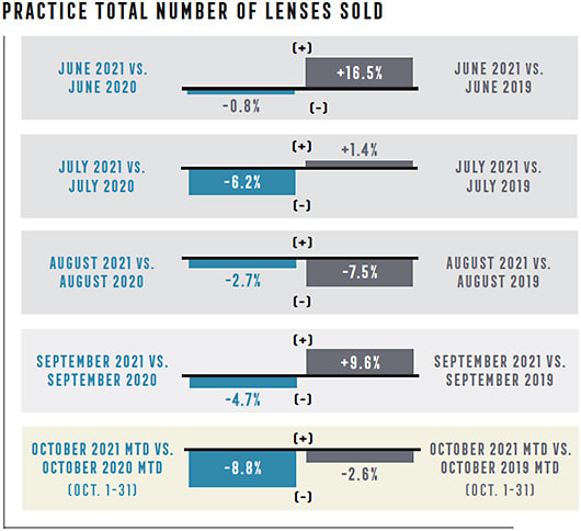 “Due to pent-up demand from closures earlier in the year, significant growth was observed in October of 2020 when compared with 2019,” says Evan Kestenbaum, co-founder and COO of GPN. “In October 2021, a decline was seen across the board in all categories when compared with both years prior. The good news is that despite exams being down by about 5% when compared with 2019, material sales have decreased at a slower rate, indicating either a higher capture rate or average selling price.”