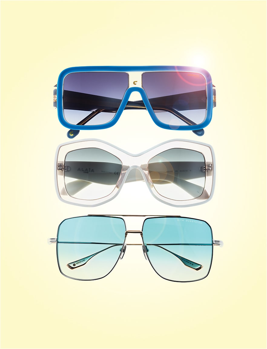 From top: The Carrera FlagLab14 from Safilo offers retro styling in a vivid blue hue. The Alaïa AA0066S sunglass from Kering Eyewear provides an outlined geometric silhouette. The Dita DubSystem DTS157 is an oversized metal aviator defined by turquoise gradient lenses.