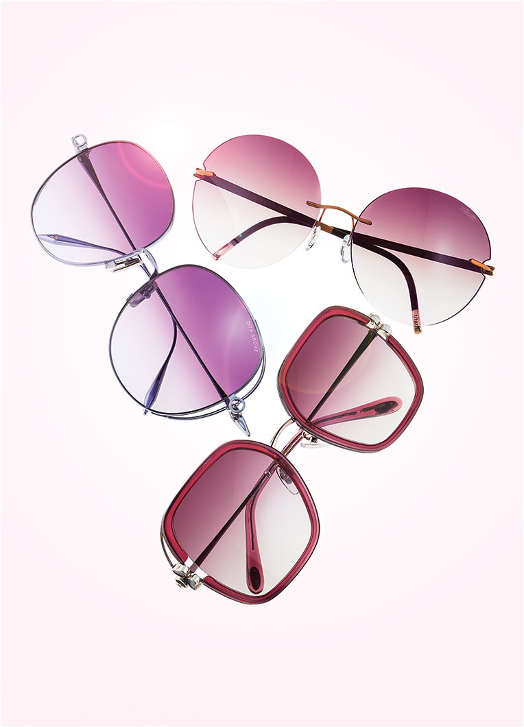 From top: The Dita Arohz DTS156 takes the hue du jour into the style zone with a gradient lens. The Calella 8190 from Silhouette also delivers the drama in a round rimless shape in the hue in gradient. The Chopard SCHG32V from De Rigo REM is a modified rectangle that boldly shows up in the Viva Magenta zone.