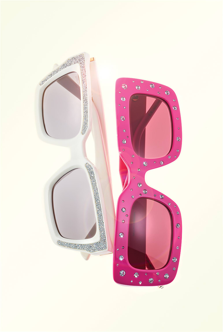 From top: The Jimmy Choo Meg/S from Safilo is a luxe white acetate style embellished with bold glitter. The Carolina Herrera HER0131/S from Safilo boasts elegant crystal detailing on a classic, oversized silhouette in a standout hue.