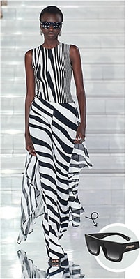 From Chanel to Michael Kors to Missoni (pictured here), black-and-white prints on flowy silhouettes offer rejuvenation for SS23. Here, the look was complete with Missoni sunglass style MIS0129S from Safilo.