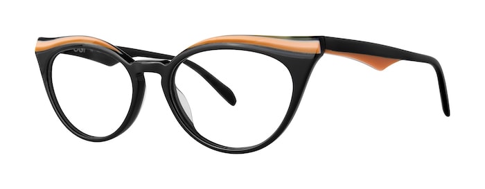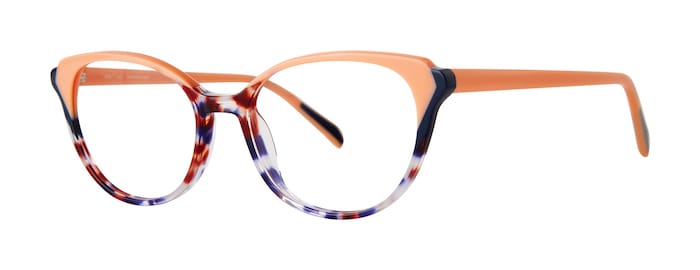 Babe, a style from OGI, lets peach pop in both the upswept brow and temples of the dark triple-laminated acetate cat-eye frame.