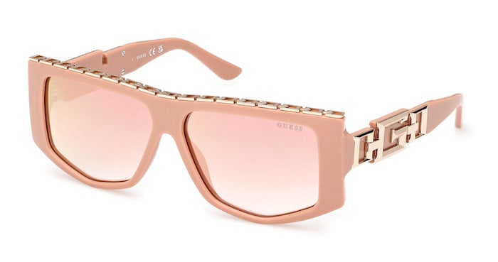 Guess’s chunky GU7914 style from Marcolin exudes glam with a bold, oversized rectangle front and metallic bling that lines the top of the frame and depicts the Guess logo on the temples.