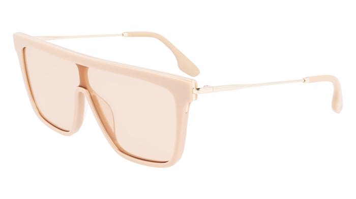 The distinctive flat-top shield style of Victoria Beckham’s VB650S from Marchon Eyewear features lightweight feminine temples that contrast the bold square front.