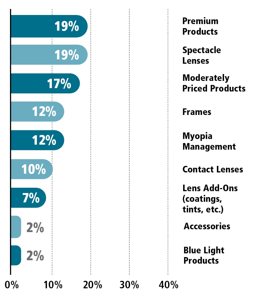 • Purchasing Plans. When asked about purchasing plans for the year in comparison to 2023 levels, 38% said they plan to increase frame purchases, 50% plan to increase spectacle lens purchases, and 48% plan to increase contact lens purchases.